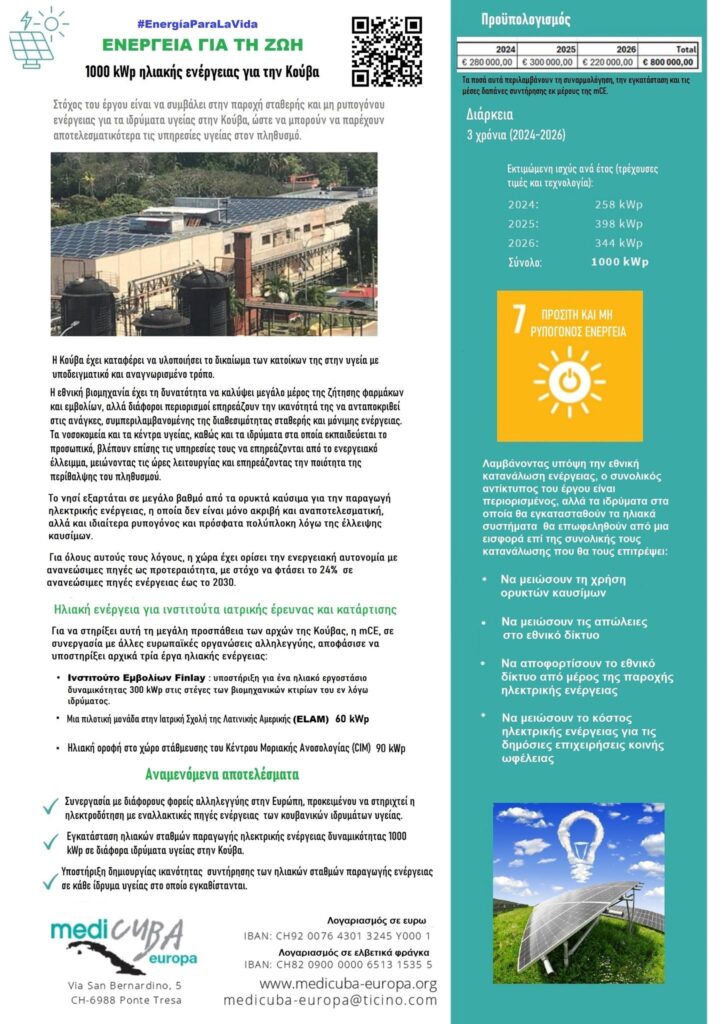Σε μια περίοδο που η Κούβα δοκιμάζεται από τον πλήρη αποκλεισμό που έχει επιβάλλει η ηγεσία του Ντόναλντ Τραμπ, σε καύσιμα, τρόφιμα, φάρμακα, με αποτέλεσμα ο λαός της να βιώνει μια ανείπωτη ανθρωπιστική κρίση, η Αλληλεγγύη για Όλους στέκεται στο πλευρό του κουβανικού λαού στηρίζοντας την εγκατάσταση 1000 kWp ηλιακής ενέργειας σε ιδρύματα υγείας. Η πρόσβαση σε σταθερή και καθαρή ενέργεια είναι κρίσιμη για τη λειτουργία των νοσοκομείων και των κέντρων ιατρικής έρευνας.