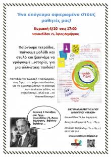 Ραντεβού την Κυριακή 4 Οκτωβρίου, στις 5 μ.μ. στο χώρο του δικτύου (Θουκυδίδου 75, Άγιος Δημήτριος), για να ολοκληρώσουμε τη διανομή των σχολικών ειδών, να συζητήσουμε, αλλά και να διασκεδάσουμε ...βεβαίως-βεβαίως!