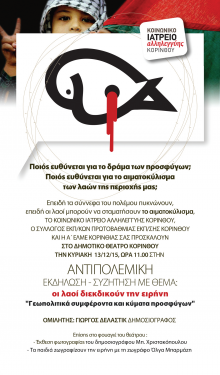Το Κοινωνικό Ιατρείο Αλληλεγγύης Κορίνθου, οι καθηγητές και οι δάσκαλοι σας καλούν την Κυριακή 13 Δεκεμβρίου στις 11.00 π.μ.στο Δημοτικό Θέατρο Κορίνθου σε αντιπολεμική εκδήλωση με προσκεκλημένο το δημοσιογράφο Γιώργο Δελαστίκ.