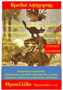 Το Σάββατο 5/3 στις 18:30 έχουμε βραδιά αφήγησης παραμυθιών με ζώα για παιδιά στη Θρυαλλίδα από την ομάδα αφήγησης "ήμουν και εγώ εκεί". Η είσοδος είναι ελεύθερη προαιρετικά φέρνουμε μπισκότα, κρουασάν, μπάρες δημητριακών , φρυγανιές, μωρομάντηλα που συγκεντρώνουμε για τους πρόσφυγες.