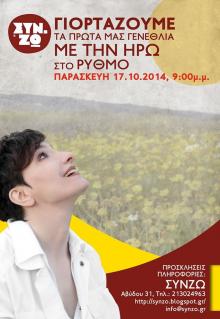 Ο Καταναλωτικός Συνεταιρισμός Ζωγράφου, γιορτάζει τον ένα χρόνο λειτουργίας και δράσης του στην περιοχή των Ιλισίων. Καλούμε όλους και όλες την Παρασκευή 17 Οκτώβρη στις 21.00 στο Ρυθμό (Γ. Παπανδρέου κ Μ. Αλεξάνδρου Ζωγράφου-χάρτης) σε μια μουσική βραδιά με τη φιλική συμμετοχή της καταξιωμένης ερμηνεύτριας Ηρώς.