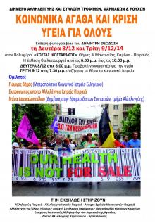 ΟΙ Δομές Αλληλεγγύης του ευρύτερου Πειραιά συναντιόμαστε στα Καμίνια, στον Πολυχώρο "Κώστας Κωσταράκος", το διήμερο Δευτέρα-Τρίτη 8-9 Δεκεμβρίου 6-10 μ.μ.και συζητάμε για το βασικότερο κοινωνικό αγαθό, την υγεία, στις συνθήκες ανθρωπιστικής κρίσης και διάλυσης του κοινωνικού κράτους που βιώνουμε.Περιμένουμε εσάς και τους φίλους σας να καταθέσετε τις εμπειρίες σας και να συμβάλετε στις συζητήσεις.