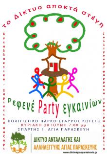 Το Δίκτυο Ανταλλαγής και Αλληλεγγύης Αγίας Παρασκευής σας καλεί στα εγκαίνια του χώρου του, την Κυριακή 28/06 και ώρα 19,00 στο πολιτιστικό πάρκο "Σταύρος Κώτσης" Σπάρτης 1 Αγία Παρασκευή.