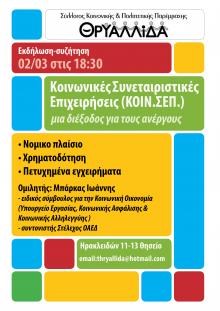 Την Τετάρτη 2/3 στις 18:30 θα γίνει συζήτηση -εκδήλωση στη Θρυαλλίδα (Ηρακλειδών 11-13 , Θησείο) με θέμα "Κοινωνικές συνεταιριστικές επιχειρήσεις μία διέξοδος για τους ανέργους " .