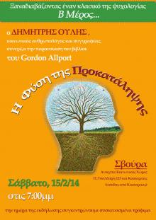 Το Σάββατο 1η Φεβρουαρίου, ο κοινωνικός ανθρωπολόγος Δημήτρης Ουλής ξεκίνησε την παρουσίαση του βιβλίου του Gordon Allport «Η Φύση της Προκατάληψης» και την ανάλυση εννοιών και συμπεριφορών. Όμως, η πολύ ενδιαφέρουσα συζήτηση που εξελίχθηκε με ερωτήσεις κι απόψεις των παραβρισκόμενων, μας ανάγκασε να διακόψουμε στη μέση την παρουσίαση του βιβλίου λόγω περασμένης ώρας και να συνεχίσουμε κάποια άλλη μέρα.