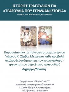Παρουσίαση οκτώ ημίωρων ντοκιμαντέρ του Γιώργου Χ. Ζέρβα. Μετά από κάθε προβολή ακολουθεί συζήτηση με τον κοινωνιολόγο -ερευνητή του ρεμπέτικου τραγουδιού Δημήτρη Υφαντή.