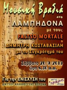 Μουσική βραδιά για τη στήριξη του Δικτύου Αλληλεγγύης Βύρωνα Σάββατο, 26 Σεπτεμβρίου, 2015 - 20:30Μουσική βραδιά για τη στήριξη του Δικτύου Αλληλεγγύης Βύρωνα το Σάββατο 26/9 στις 8.30. ΔΙΑΔΩΣΤΕ: Tweet ΣΤΟΙΧΕΙΑ ΕΠΙΚΟΙΝΩΝΙΑΣ Κορδελίου & Κονσταντιλιέρη