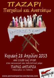 ΠΑΖΑΡΙ-Πασχαλινό και Αναστάσιμο... Κυριακή, 28 Απριλίου, 2013 - 11:00 ως 19:00 Πασχαλινό παζάρι από 11:00 έως 19:00 Λαμπάδες, τζίτζιλα,΄μίτζιλα κλπ.... Στον κοινωνικό και πολιτιστικό χώρο "Παίρνω Αμπάριζα" Γαλακηδών 11 Γαλάτσι ΔΙΑΔΩΣΤΕ: Tweet Συνδεσμοι: http://pernoampariza.wordpress.com/ ΣΤΟΙΧΕΙΑ ΕΠΙΚΟΙΝΩΝΙΑΣ Δήμος Γαλατσίου