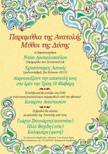 Η βραδιά θα ανοίξει με την αφήγηση ανατολίτικου παραμυθιού από την ηθοποιό Κατερίνα Αναστασίου και θα κλείσει με μελωδίες της Ανατολής από τους μουσικούς Γιώργο Στογιώργη (κανονάκι), Ηλία Φαχίδη (ούτι) και Καλομοίρα (φωνή)