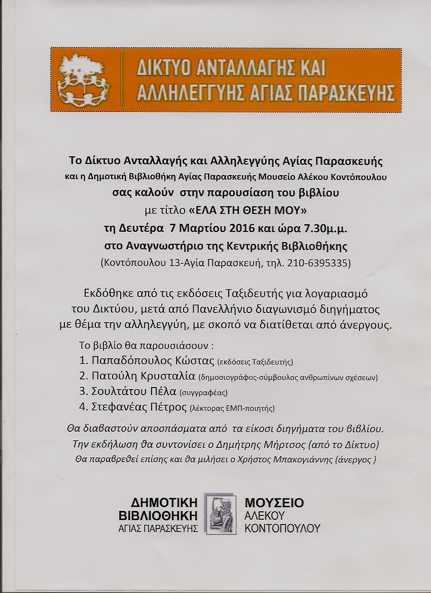 Το Δίκτυο Ανταλλαγής και Αλληλεγγύης Αγίας Παρασκευής και η Δημοτική Βιβλιοθήκη Αγίας Παρασκευής - Μουσείο Αλέκου Κοντόπουλου σας καλούν στην παρουσίαση του βιβλίου με τίτλο "ΈΛΑ ΣΤΗ ΘΕΣΗ ΜΟΥ" τη Δευτέρα 7 Μαρτίου 2016 και ώρα 7.30 μ.μ. στο Αναγνωστήριο της Κεντρικής Βιβλιοθήκης (Κοντόπουλου 13, Αγ. Παρασκευή, τηλ. 210-6395335).
