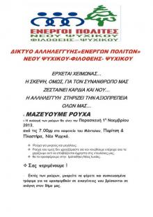 Συλλογή ρούχων Δομή: "Ενεργοί Πολίτες Νέου Ψυχικού-Φιλοθέης-Ψυχικού " Δίκτυο Αλληλεγγύης Παρασκευή, 1 Νοεμβρίου, 2013 - 19:00Το Δίκτυο Αλληλεγγύης Ενεργών Πολιτών Νέου ΨΥχικού Φιλοθέης Ψυχικού συγκεντρώνει ρούχα για την ενίσχυση της Ιματιοθήκης Νέας Ιωνίας. ΔΙΑΔΩΣΤΕ: Tweet ΣΤΟΙΧΕΙΑ ΕΠΙΚΟΙΝΩΝΙΑΣ Παρίτση & Πλαστήρα (καφενείο Μάνταλου)