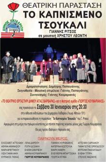 Το θεατρικό εργαστήρι του Δήμου Αγίας Βαρβάρας και η ομάδα "Γιώργος Κουμαριανός "σας προσκαλούν στη δραματοποιημένη παρουσίαση του ποιητικού έργου του Γιάννη Ρίτσου "Το Καπνισμένο Τσουκάλι" σε μουσική του Χρήστου Λεοντή και δραματοποίηση, σκηνοθεσία Δημήτρη Παπαγιάννη και Γιάννης Παπαγιάννης.