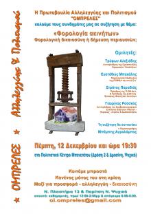 Η Πρωτοβουλία Αλληλεγγύης και Πολιτισμού “ΟΜΠΡΕΛΕΣ” διοργανώνει συζήτηση με θέμα «Φορολογία ακινήτων: φορολογική δικαιοσύνη ή δήμευση περιουσιών;» την Πέμπτη, 12 Δεκεμβρίου και ώρα 19:30 στο Πολιτιστικό Κέντρο Μπενετάτου, Δρόση 2 & Δροσίνη, στο Ψυχικό. Ομιλητές: Τρύφων Αλεξιάδης, Αντιπρόεδρος της Ομοσπονδίας Εφοριακών Υπαλλήλων, Ευστάθιος Μπακάλης Φορολογικός Σύμβουλος της ΠΟΜΙΔΑ και του Δ.Σ.Α., Στράτος Παραδιάς, Πρόεδρος της Π.ΟΜ.ΙΔ.Α. & Πρόεδρος της Διεθνούς Ενώσεως ιδιοκτητών Ακινήτων και Γεώργιος Ρούσκας Αντιπρόεδρος του Συμβoλαιογραφικού Συλλόγου Εφετείων Αθηνών-Πειραιώς-Αιγαίου & Δωδ/νήσου. Τη συζήτηση θα συντονίσει ο δημοσιογράφος Μπάμπης Αγρολάμπος