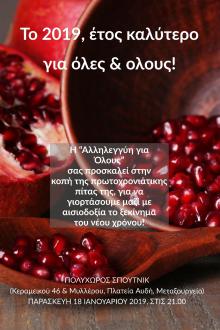 Η "Αλληλεγγύη για Όλους" σας προσκαλεί στην κοπή της πρωτοχρονιάτικης πίτας της, την Παρασκευή 18/1, στις 9μμ, στον Πολυχώρο Σπούτνικ, Κεραμεικού 46 & Μυλλέρου, στην πλατεία Αυδή, στο Μεταξουργείο, για να γιορτάσουμε μαζί, με αισιοδοξία κι αλληλεγγύη, το ξεκίνημα του νέου χρόνου!