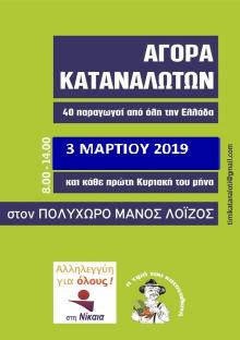 Η Αλληλεγγύη για όλους στη Νίκαια, στις 30 Δεκεμβρίου, από τις 8 πμ έως τις 2μμ, στον πολυχώρο Μ. Λοίζος πραγματοποιεί την ''Αγορά Καταναλωτών'', με τη συμμετοχή 40 παραγωγών από ολη την Ελλάδα και τη διάθεση περισσοτέρων προϊόντων, με βάση την απευθείας συνεργασία καταναλωτών και παραγωγών.