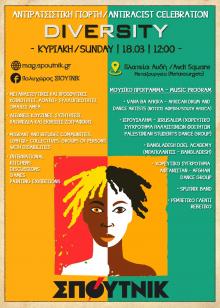 Σε αυτό το πλαίσιο, το ΣΠΟΥΤΝΙΚ διοργανώνει, την Κυριακή 18 Μαρτίου, το «DIVERSITY», μια μεγάλη γιορτή, με κεντρικό άξονα τον αντιρατσισμό και τη διαφορετικότητα. Στόχος μας είναι να αναδειχθεί και να εξαπλωθεί η σημασία της άρσης κάθε είδους διάκρισης.