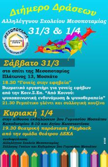 Το "Αλληλέγγυο Σχολείο Μεσοποταμίας" διοργανώνει διήμερο κοινωνικών και πολιτιστικών δράσεων, το Σάββατο 31/3 & την Κυριακή 1/4. Το Σάββατο 31/3, στο σπίτι της Μεσοποταμίας, Πλάτωνος 13, Μοσχάτο: "Γονείς 'στην εφηβεία'" (βιωματικό εργαστήρι για γονείς εφήβων). Ακολουθεί ρεμπέτικο γλέντι και συλλογική κουζίνα. Την Κυριακή 1/4, στην αιθ. εκδηλώσεων του 2ου Γυμνασίου Μοσχάτου, Καποδιστρίου 8-10 και Αγίου Κων/νου, Μοσχάτο: Θεατρική παράσταση Playback από την ομάδα ΔΕΚΑ.