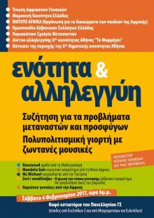 Εκδήλωση το Σάββατο (4/2) στις 18:00 στο Καφέ - Εστιατόριο του Πανελλήνιου ΓΣ με θέμα "Ενότητα και Αλληλεγγύη". Συζήτηση για τα προβλήματα μεταναστών και προσφύγων και πολυπολιτισμική γιορτή με ζωντανές μουσικές.