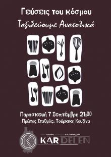 Ξεκινάει μια ακόμη χρονιά στο στέκι kardelen με τον πιο ομορφο τρόπο: την Παρασκευή 7 Σεπτέμβρη στις 21:00 ταξιδεύουμε ανατολικά. Πρώτη στάση: Τουρκία. Με τις γεύσεις της γειτονιάς μας που μας τις συστήνει η Σεριφέ μαγειρεύοντας παραδοσιακά εδέσματα. Σας περιμένουμε όλες και όλους.