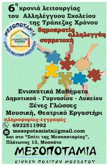 Το Αλληλέγγυο Σχολείο Μεσοποταμίας υποστηρίζει εδώ και πέντε χρόνια τις εκπαιδευτικές ανάγκες όλων των ηλικιών, αναπτύσσοντας παράλληλα δράσεις κοινωνικού και πολιτιστικού χαρακτήρα, με συμμετοχή, δημοκρατία, αλληλεγγύη.
