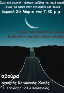 Ζωντανή μουσική, νόστιμοι μεζέδες και καλό κρασί... Την Κυριακή 25 Μαρτίου, στις 7.30, σας περιμένουμε με ζεστή παρέα, νοστιμους μεζέδες και όμορφες μελωδίες.. 5 ευρώ για την ενίσχυση του χώρου, ευπρόσδεκτα και κάθε είδους καλούδια!