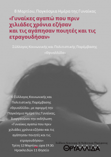 Ο Σύλλογος Κοινωνικής και Πολιτιστικής Παρέμβασης «Θρυαλλίδα», με αφορμή την Παγκόσμια Ημέρα της Γυναίκας, διοργανώνει την εκδήλωση «Γυναίκες αγαπώ που πριν χιλιάδες χρόνια εζήσαν και τις αγάπησαν ποιητές και τις ετραγουδήσαν» την Τρίτη 12 Μαρτίου, ώρα 19.30.