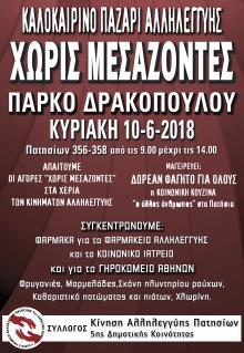 Ο Σύλλογος «Κίνηση Αλληλεγγύης Πατησίων 5ης Δημοτικής Κοινότητας» σας προσκαλεί στο Πάρκο Δρακόπουλου, την Κυριακή 10 Ιουνίου 2018, από τις 9.00 το πρωί έως τις 14.00 το μεσημέρι, σ' ένα καλοκαιρινό Παζάρι Αλληλεγγύης και αγορά Χωρίς Μεσάζοντες. Μικροί παραγωγοί προσφέρουν ποιοτικά προϊόντα σε χαμηλές τιμές, και βοηθάνε με την αλληλέγγυα δράση της Κίνησης μας οικογένειες που έχουν ανάγκη.