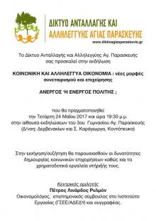 Σας περιμένουμε την Τετάρτη 24 Μαΐου 2017 και ώρα 19:30 μ.μ. στην αίθουσα εκδηλώσεων του 3ου Γυμνασίου Αγ. Παρασκευής