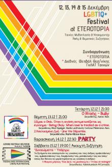Έχουμε τη χαρά να συνδιοργανώνουμε για 1η φορά με το Thessaloniki International L.G.B.T.Q Film Festival, ένα 4ημερο φεστιβάλ. Ταινίες μεγάλου & μικρού μήκους, συζητήσεις αλλά και party θα γεμίσουν την ΕΤΕΡΟΤΟΠΙΑ στις 12, 13, 14 & 15 Δεκέμβρη.