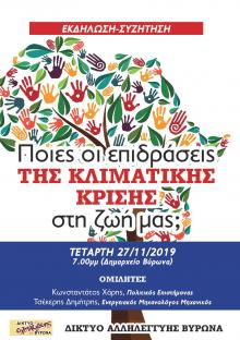 Το Δίκτυο Αλληλεγγύης Βύρωνα σας προσκαλεί στο Δημαρχείο Βύρωνα, τη Τετάρτη 27/11/2019 στις 19:00, στην εκδήλωση – συζήτηση «Ποιες οι επιδράσεις της κλιματικής κρίσης στη ζωή μας;»