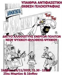 YΠΑΙΘΡΙΑ ΑΝΤΙΦΑΣΙΣΤΙΚΗ ΕΚΘΕΣΗ ΓΕΛΟΙΟΓΡΑΦΙΑΣ ΑΠΟ ΤΟ ΔΙΚΤΥΟ ΑΛΛΗΛΕΓΓΥΗΣ ΕΝΕΡΓΩΝ ΠΟΛΙΤΩΝ Δομή: "Ενεργοί Πολίτες Νέου Ψυχικού-Φιλοθέης-Ψυχικού " Δίκτυο Αλληλεγγύης Σάββατο, 16 Νοεμβρίου, 2013 - 11:30 ΔΙΑΔΩΣΤΕ: Tweet ΣΤΟΙΧΕΙΑ ΕΠΙΚΟΙΝΩΝΙΑΣ 25ης Μαρτίου & ΞάνθουΔήμος Φιλοθέης-Ψυχικού