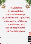 Στο Αλληλέγγυο Σχολείο Ταύρου το Σάββατο 21 Δεκεμβρίου θα κάνουμε κατασκευές, θα στολίσουμε, θα παίξουμε, θα τραγουδήσουμε, θα φάμε και θα πιούμε ΟΛΟΙ ΜΑΖΙ, μεγάλοι και μικροί, όλοι ίσοι, όλοι...