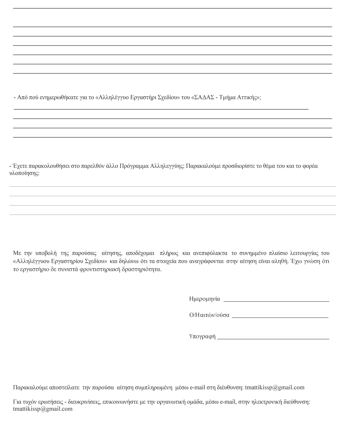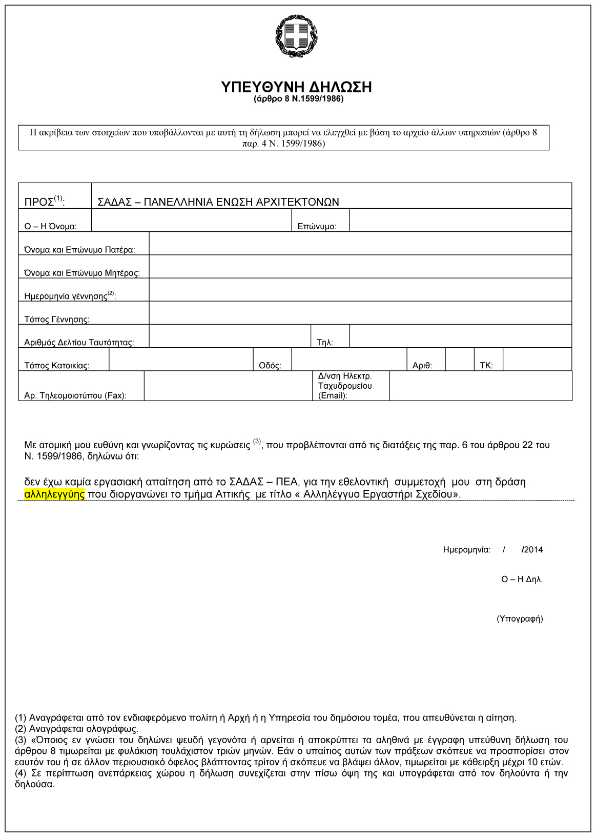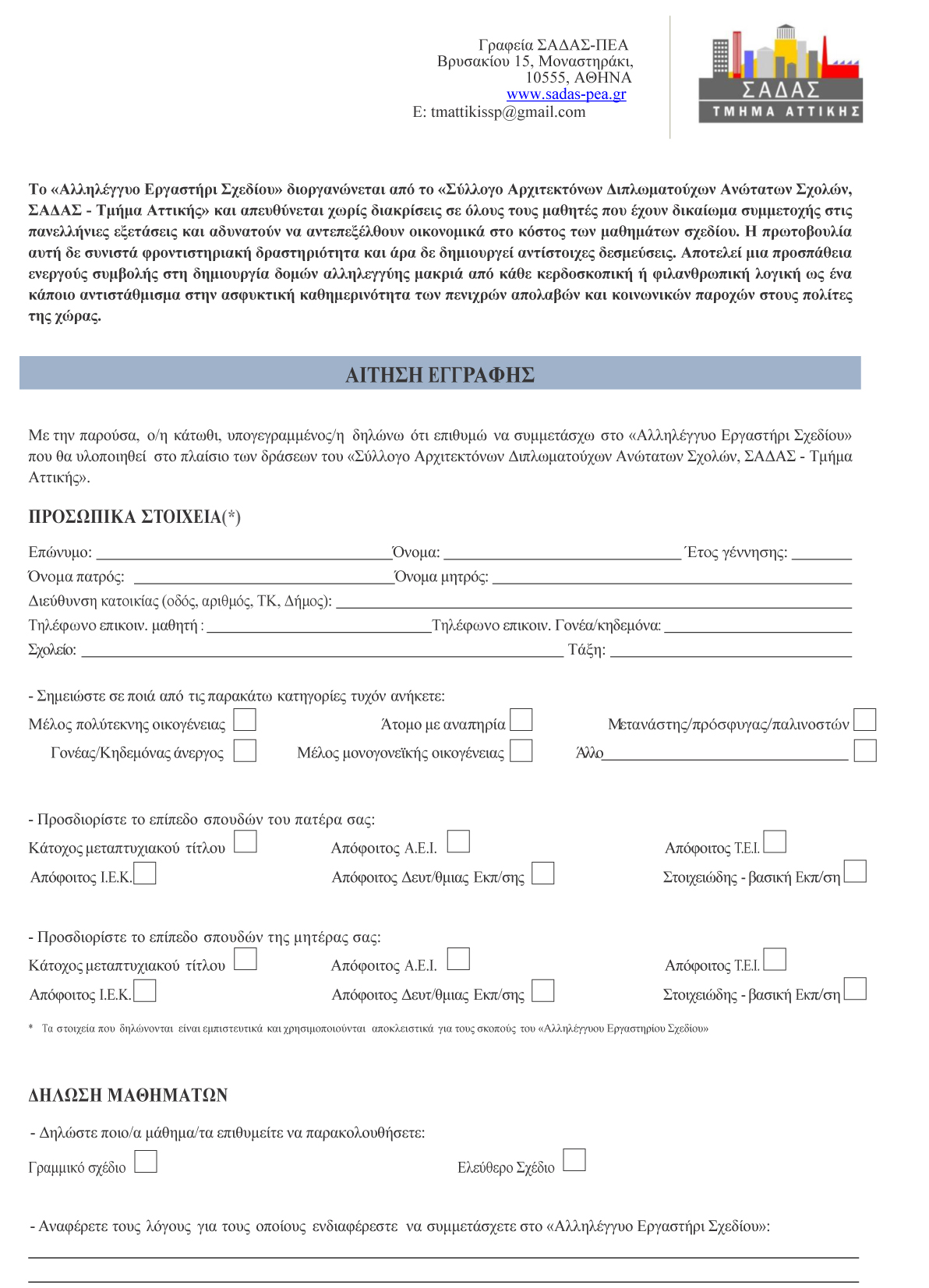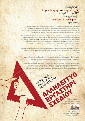 Το τμήμα Αττικής του ΣΑΔΑΣ καλεί τα μέλη του για συμμετοχή στην δράση του Αλληλέγγυου Εργαστηρίου Σχεδίου. H εναρκτήρια εκδήλωσή του θα γίνει την Δευτέρα 13.10.14 και ώρα 19:00 στο αμφιθέατρο του ΤΕΕ (Νίκης 4, Αθήνα).