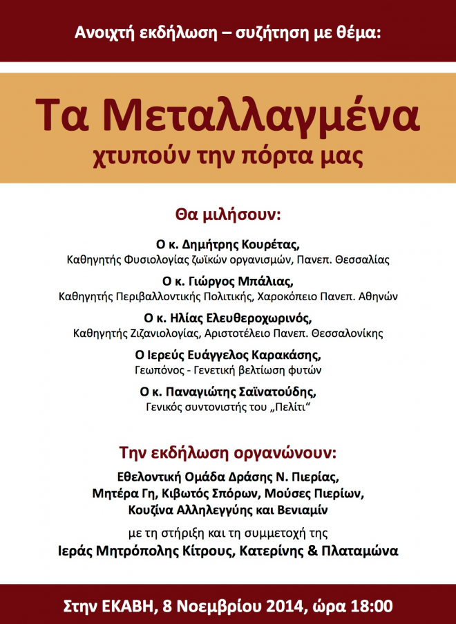 Μια ιδιαίτερα ενδιαφέρουσα ενημερωτική εκδήλωση για τα μεταλλαγμένα και τους γενετικά τροποποιημένους οργανισμούς διοργανώνεται το Σάββατο 8 Νοεμβρίου 2014, ώρα 18:00στο Συνεδριακό Κέντρο Κατερίνης «ΕΚΑΒΗ», από την Εθελοντική Ομάδα Δράσης Ν. Πιερίας, τη Μητέρα Γη, την Κιβωτό Σπόρων, τις Μούσες Πιερίων, την Κουζίνα Αλληλεγγύης και τον σύλλογο προστασίας παιδιών «Βενιαμίν», με τη στήριξη και τη συμμετοχή της Ιεράς Μητρόπολης Κίτρους, Κατερίνης & Πλαταμώνα.