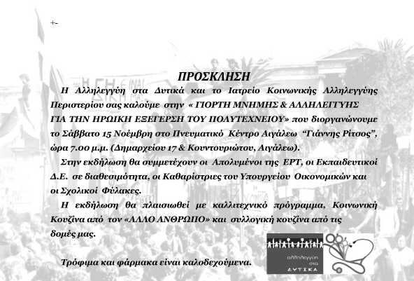 Σας καλούμε το ΣΑΒΒΑΤΟ 15 ΝΟΕΜΒΡΙΟΥ , 7.00 μ.μστο Πνευματικό κέντρο "Γιάννης Ρίτσος", στο Αιγάλεω