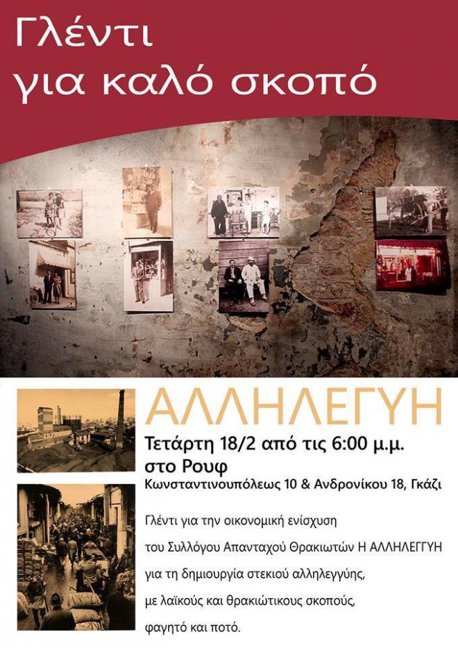Γλέντι για την οικονομική ενίσχυση του Συλλόγου Απανταχού Θρακιωτών "Η ΑΛΛΗΛΕΓΓΥΗ" για τη δημιουργία στεκιού αλληλεγγύης, με λαϊκούς και θρακιώτικους σκοπούς, φαγητό και ποτό!