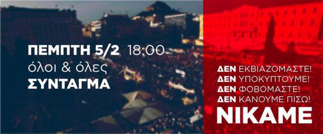 Κατεβαίνουμε στο Σύνταγμα και τις άλλες πλατείες της χώρας την Πέμπτη 5/2 στις 18.00 και όσες άλλες μέρες χρειαστεί, για να στείλουμε το μήνυμα σε όσους νομίζουν ότι μας έχουν στο χέρι, ότι κάτι δεν έχουν καταλάβει καλά.