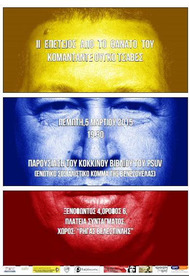 Αθήνα, 3 Μαρτίου 2015. Τα κοινωνικά κινήματα και οι ομάδες φιλίας και αλληλεγγύης με τη Βενεζουέλα, ανάμεσα στους οποίους το Ελληνικό Δίκτυο Αλληλεγγύης, o Σύνδεσμος Λατινοαμερικάνων και Ισπανών στην Ελλάδα (ASCLAYE), η Ένωση Παλαιστίνιων Εργαζόμενων στην Ελλάδα, ο Σύλλογος Al-Awda Δικαίωμα στην Επιστροφή Παλαιστινίων Προσφύγων, οι Hasta la Victoria Siempre, ο Σύλλογος José Martí, η Αλληλεγγύη για Όλους, η ERT-OPEN και ο Εκδοτικός Οίκος «Ταξιδευτής», με τη στήριξη της Πρεσβείας της Μπολιβαριανής Δημοκρατίας της Βενεζουέλας στην Ελλάδα, οργανώνουν ένα αφιέρωμα στον Κομαντάντε Ούγκο Τσάβες, την Πέμπτη 5 Μαρτίου, στις 19:30, στο χώρο πολιτισμού και πολιτικής «Ρήγας Βελεστινλής», στην οδό Ξενοφώντος 4, στον 6ο όροφο, στην Πλατεία Συντάγματος, με αφορμή τη δεύτερη επέτειο από την αποβίωση του ηγέτη της Μπολιβαριανής Επανάστασης στις 5 Μαρτίου 2013.