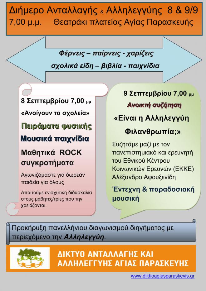 Το δίκτυο Ανταλλαγής και Αλληλεγγύης Αγίας Παρασκευής διοργανώνει διήμερο Ανταλλαγής και Αλληλεγγύης στις 8 και 9 Σεπτεμβρίου από τις 7 μ.μ. στο Θεατράκι της Κεντρικής Πλατείας.