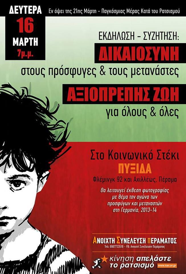 Εν όψει της 21ης Μάρτη, Παγκόσμιας μέρας κατά του Ρατσισμού, η "Ανοιχτή Συνέλευση Περάματος" και η Κίνηση "Απελάστε το Ρατσισμό" οργανώνουν εκδήλωση-συζήτηση "Δικαιοσύνη στους πρόσφυγες & μετανάστες - Αξιοπρεπής ζωή για όλους & όλες". Στο Κοινωνικό Στέκι "Πυξίδα", Φλέμινγκ & Αχιλλέως στο Πέραμα.