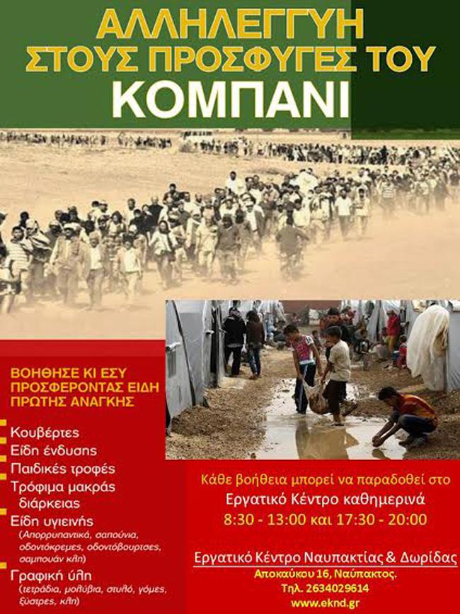 Το Εργατικό Κέντρο Ναυπακτίας και Δωρίδας, σε μία κίνηση αλληλεγγύης και συμπαράστασης στο δοκιμαζόμενο λαό του Κομπάνι Συρίας, καλεί τους πολίτες να συνεισφέρουν στη συγκέντρωση φαρμάκων, τροφίμων και ρούχων στο Εργατικό Κέντρο από Δευτέρα έως Παρασκευή και ώρες 08:30 – 13:30 και 17:30-20:00.