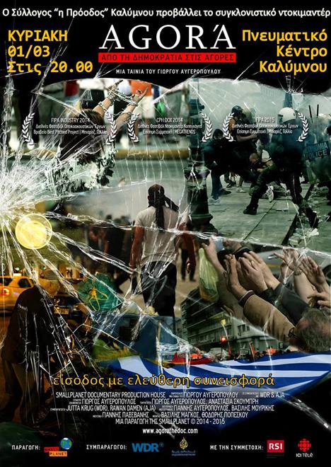 Την Κυριακή 1η Μάρτη, στις 8μμ, στην αίθουσα του Πνευματικού Κέντρου Καλύμνου προβάλλεται το πολυσυζητημένο ντοκιμαντέρ "AGORA", του Γ. Αυγερόπουλου, από τον πολιτιστικό σύλλογο Καλύμνου "Η Πρόοδος" . Είσοδος με ελεύθερη συνεισφορά.