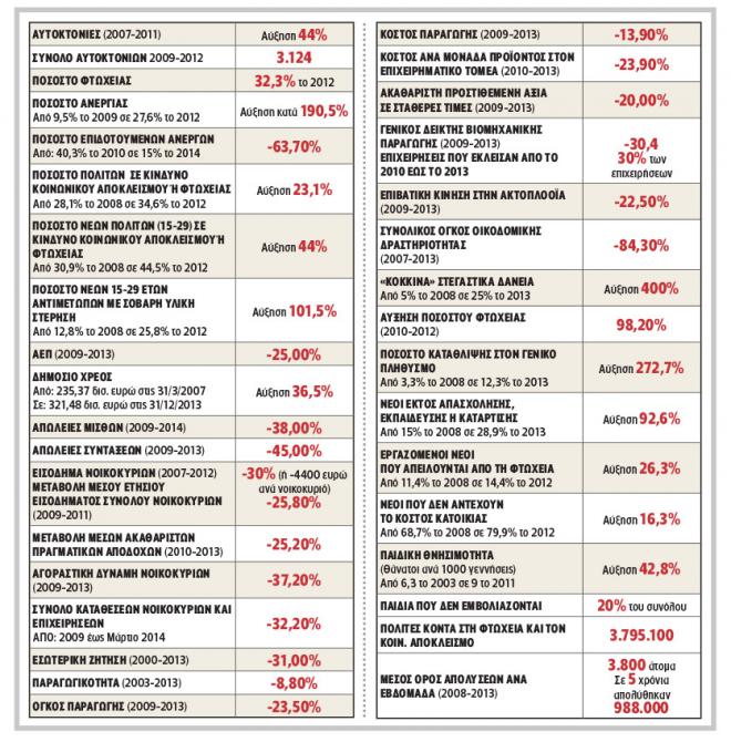 Δεν χρειάζεται να πούμε πολλά λόγια για να παρουσιάσουμε και να αναλύσουμε τα πιο πάνω στοιχεία του πίνακα – τα οποία βεβαίως αποτελούν μόνον ένα μικρό μέρος του συνόλου των οικονομικών και κοινωνικών στατιστικών δεδομένων που ο συνδυασμός τους αποτυπώνει με ακρίβεια τη ζοφερή μνημονιακή πραγματικότητα.