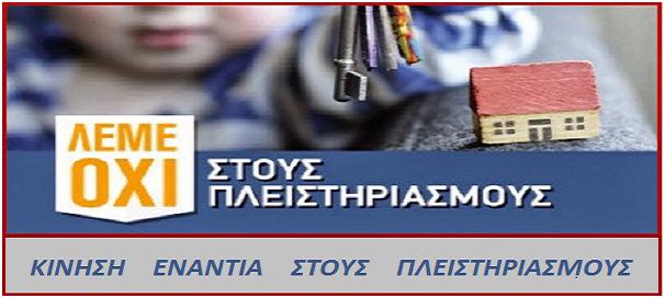 Εμείς, οι πολίτες και οι συλλογικότητες που συγκροτήσαμε την «ΚΙΝΗΣΗ ΕΝΑΝΤΙΑ ΣΤΟΥΣ ΠΛΕΙΣΤΗΡΙΑΣΜΟΥΣ» θεωρούμε χρέος μας να διαμαρτυρηθούμε και να αντισταθούμε σ’ αυτήν την αντιλαϊκή πολιτική που καταλύει καθημερινά τη δικαιοσύνη και τη δημοκρατία. Τα σπίτια και οι περιουσίες μας δεν ανήκουν σε κανέναν, παρά μόνο σε εμάς.