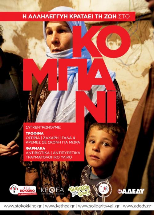 Η ευθύνη της διεθνούς κοινότητας είναι τεράστια. Εμείς, η Ελλάδα της κρίσης και της φτώχειας, αποφασίσαμε να σηκώσουμε ένα μέρος αυτής της ευθύνης. Μπροστά στην εικόνα των προσφύγων και της ανθρωπιστικής κρίσης ο ρ/σ Στο Κόκκινο, το ΚΕΘΕΑ, η Αλληλεγγύη για όλους, το Συντονιστικό κοινωνικών ιατρείων-φαρμακείων αλληλεγγύης Αττικής και η ΑΔΕΔΥ οργανώνουν πανελλαδική εκστρατεία αλληλεγγύης για τους πρόσφυγες του Κομπάνι και των γύρω περιοχών με τη συμμετοχή δήμων και ραδιοφωνικών σταθμών όλης της χώρας.