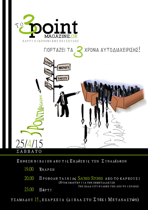 Το ανεξάρτητο και αυτοδιαχειριζόμενο περιοδικό 3pointmagazine.gr κλείνει 3 χρόνια ζωής και το γιορτάζει με ένα μεγάλο πάρτι το Σάββατο 25 Απριλίου, στα Εξάρχεια (Τσαμαδού 15, δίπλα από το Στέκι Μεταναστών) από τις 19.00.