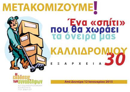 Αυτό τον χώρο τον βρήκαμε στην οδό Καλλιδρομίου 30, στα Εξάρχεια και από 12 Ιανουαρίου 2015 θα είμαστε πια εκεί. Όμως η μετακόμιση απαιτεί χρήματα. Ράφια, πάγκοι, βιβλιοθήκες, τραπέζια, καρέκλες, προτζέκτορας και πανί για προβολές κοστίζουν και οι οικονομικές δυνατότητές μας είναι περιορισμένες. Απευθυνόμαστε λοιπόν στους απλούς ανθρώπους. Όχι σε χορηγούς ή επενδυτές. Απευθυνόμαστε στον κόσμο της βιοπάλης. Στον κόσμο των κοινωνικών κινημάτων, της κριτικής σκέψης, του πολιτισμού. Σε όλους και όλες που οραματίζονται εστίες που θα κρατήσουν ζωντανή τη φλόγα και που θα ανάψουν καινούργιες σπίθες αντίστασης, αλληλεγγύης και πολιτισμού.
