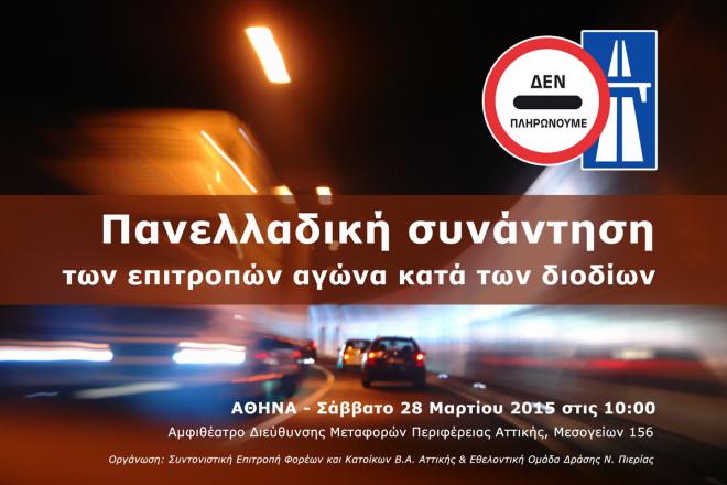 Εξειδικευμένοι επιστήμονες, νομικοί, πολίτες και πολιτικοί συζητούν για τις συμβάσεις παραχώρησης, την κατάργηση των νόμων Ρέππα-Βορίδη και τις νέες μορφές αγώνα κατά των διοδίων το Σάββατο 28 Μαρτίου 2015 στις 10:00 π.μ. στο αμφιθέατρο της Διεύθυνσης Μεταφορών Περιφέρειας Αττικής, Μεσογείων 156, στην Αθήνα.