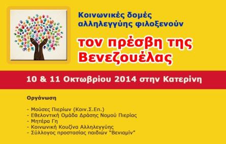 Μετά από σειρά συναντήσεων κι επισκέψεων του κυρίου πρέσβη στο νομό και την πόλη μας, θα συναντηθούμε όλοι στην κεντρική εκδήλωση η οποία θα γίνει το Σάββατο 11 Οκτώβρη στο αμφιθέατρο του δημοτικού πάρκου Κατερίνης στις 18.30 το απόγευμα.(Εναλλακτικά, και αν οι καιρικές συνθήκες δεν το επιτρέπουν, θα βρεθούμε στην πάνω αίθουσα της Εκάβης). Σε αυτήν την εκδήλωση θα γίνει σύντομη αυτοπαρουσίαση των τοπικών δομών κοινωνικής αλληλεγγύης και θα κατατεθεί από τη μεριά του κυρίου πρέσβη η αντίστοιχη εμπειρία της δικής του χώρας. Μαζί μας θα είναι οι “Μελωδοί της Παράδοσης” με ελληνικούς ήχους και αρώματα. Τη βραδιά θα κλείσει μουσικό σχήμα από τη Βενεζουέλα.