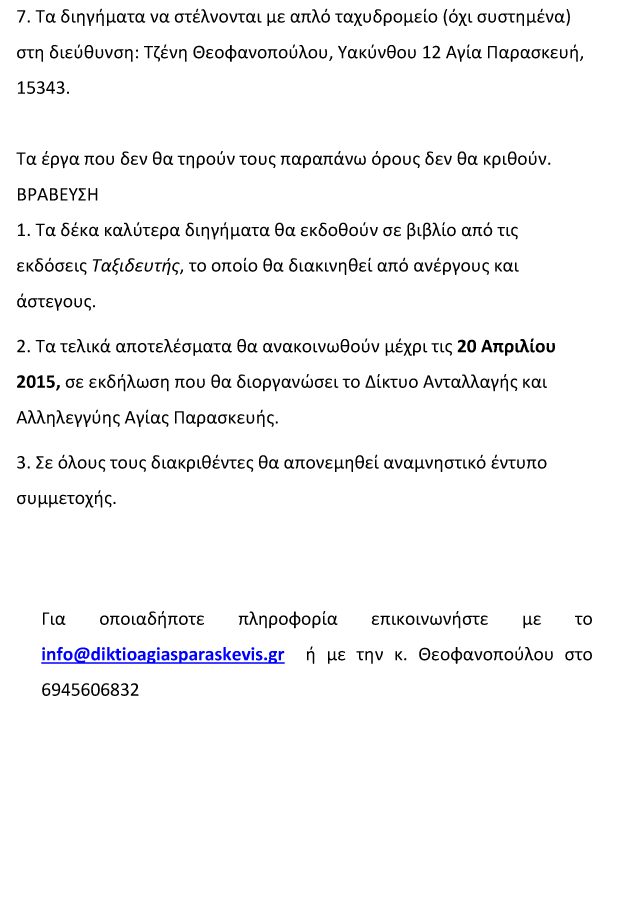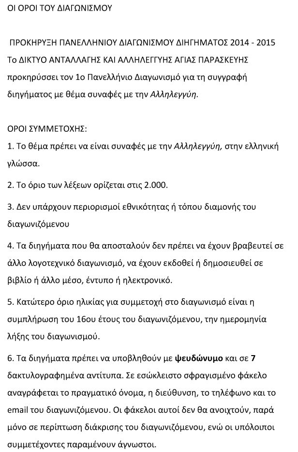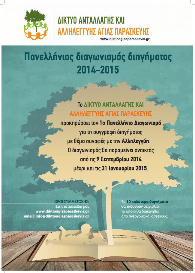 Πανελλήνιο Διαγωνισμό Διηγήματος προκήρυξε το Δίκτυο Ανταλλαγής και Αλληλεγγύης Αγίας Παρασκευής με θέμα συναφές με την Αλληλεγγύη.